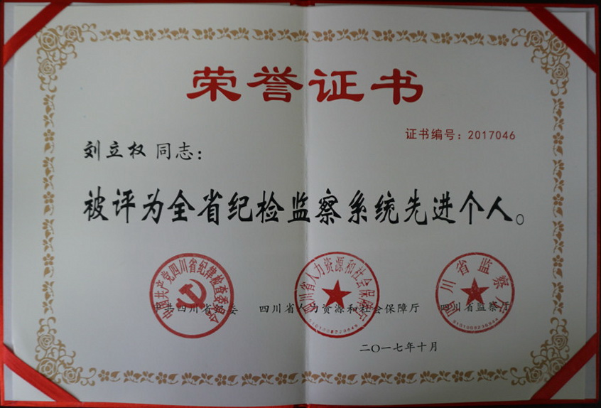 10月13日,四川省纪检监察系统表彰大会在成都金牛宾馆召开。我校纪委副书记、纪委办公室(监察处)主任(处长)刘立权同志作为省属高校唯一获奖者,荣获“全省纪检监察系统先进个人”荣誉称号。
