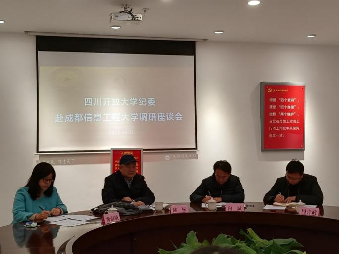 12月21日上午,四川开放大学党委副书记、纪委书记陈标,纪委副书记、纪委办主任、监察处处长向斌及相关科室负责同志来我校就纪检监察工作开展情况进行调研。省纪委监委驻校纪检监察组组长,校党委副书记、纪委书记雷超,省纪委监委驻校纪检监察组副组长,校纪委副书记、纪检监察室主任唐艳等陪同调研并参加座谈。