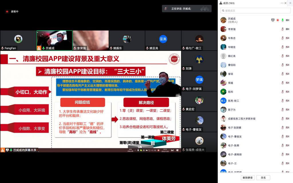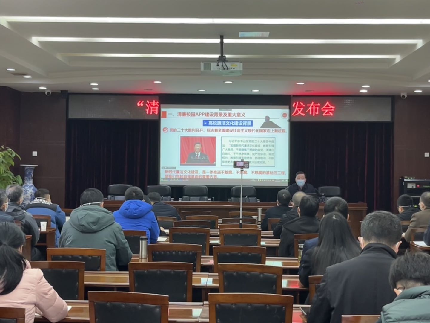 雷超从项目的背景及意义、功能及特性、试运行安排及目标任务三个方面讲解了“清廉校园”APP项目情况。他提到,党的二十大报告对坚定不移全面从严治党作出一系列重要部署,对开展新时代廉洁文化建设提出了新任务新要求。学校开展“清廉校园”APP建设,正是准确把握新时代廉洁文化建设的内涵要求,推动全面从严治党向纵深发展的具体行动和创新举措。作为一款专门用于开展高校廉洁文化建设的宣传学习教育公共服务平台,“清廉校园”APP的建设和推广,将有利于提升高校师生的政治素养、纪法观念以及廉洁意识,有利于提升高校治理体系和治理能力现代化建设,有利于在无感中优化高校教书育人环境,有利于实现高校师生德、廉评价的具象化、可量化。