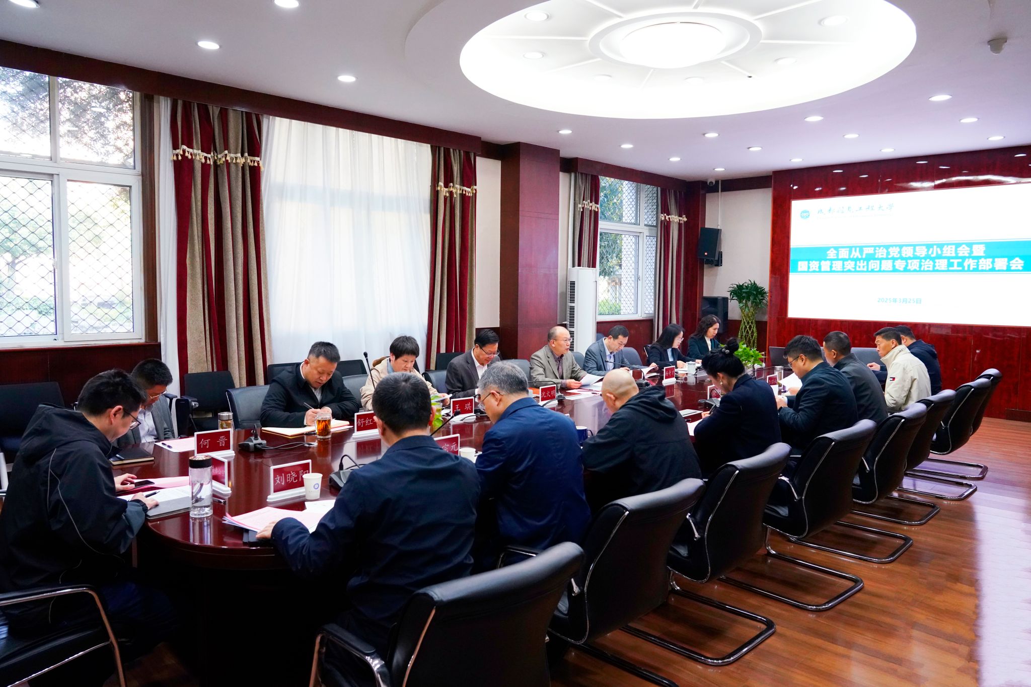 3月25日上午,学校在航空港校区召开全面从严治党领导小组会暨国资管理突出问题专项治理工作部署会。学校党委书记沈火明,党委副书记、校长何建新。分管校领导省纪委监委驻校纪检监察组组长、党委副书记、纪委书记王琪,党委副书记杨奇才,党委常委、副校长舒红平,党委常委、副校长罗小蓉。学校党委常委、副校长何晋,党委常委、机关党委书记、党委宣传部部长张小红,以及党委保卫部、审计处、计划财务处、后勤基建处、资产管理处、实验与设备管理中心、四川成信资产经营有限公司等单位主要负责人参加会议。何建新主持会议。