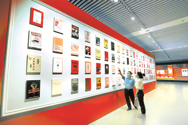 图为近日观众在国家图书馆观看展出的不同版本的《共产党宣言》。此次《共产党宣言》专题展展出中文、德文、俄文、英文、法文等55种语言的《共产党宣言》版本达306种,其中中文版本共78种。 (图片来源:人民视觉)