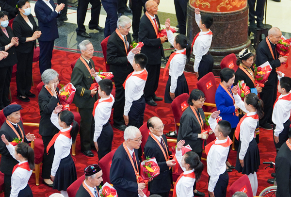 庆祝中国共产党成立100周年“七一勋章”颁授仪式在北京人民大会堂金色大厅隆重举行。图为少先队员向勋章获得者献花,敬礼致意。 新华社记者 (高洁 摄)