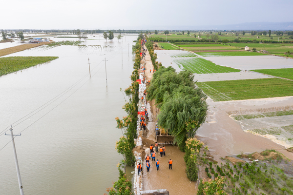连日来,共产党员带头奋战在山西抗洪第一线、最前沿,全力保障人民群众生命财产安全。图为山西省河津市党员干部带领群众加固临时堤坝。 (图片来源:人民视觉)